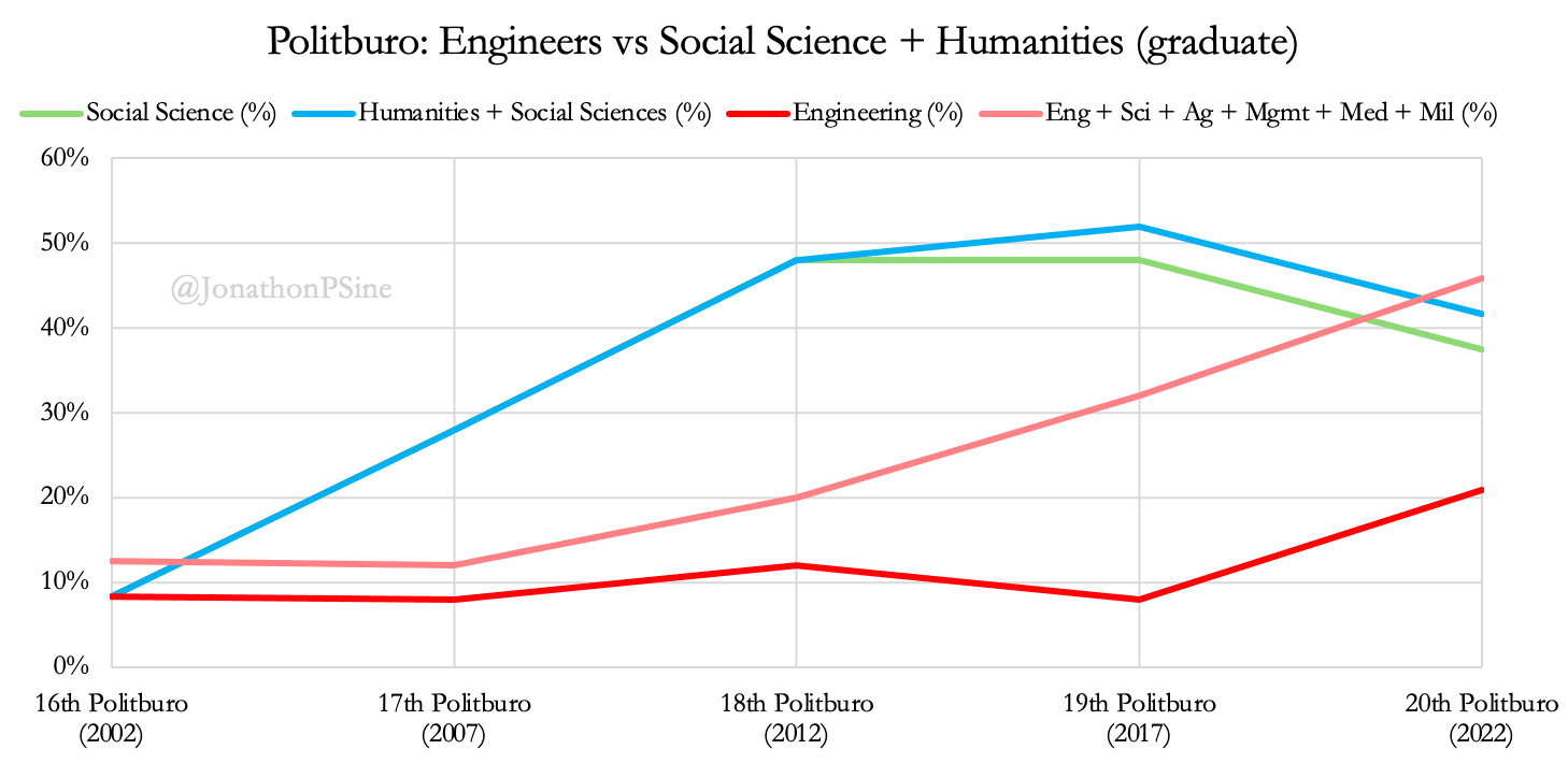 Overall the picture that comes into focus—particularly at China’s apex—is a Party-state more professional-managerial than strictly engineering. Perhaps pedantic, but “managerial elite,” “managerial class” a-la James Burnham, or technocracy, or John Kenneth Galbraith’s “technostructure,” etc could all be more comprehensive.24