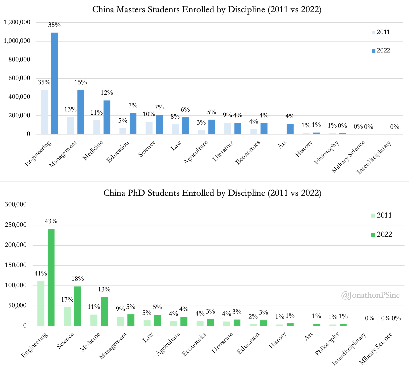 The engineering tilt is even more intense at the graduate level. The data below compare the evolution of masters and PhD enrollments between 2011 and 2022. Over 43% of China’s 556,000 PhD students in 2022 and 35% of China’s 3 million masters students were studying engineering, both up from 2011.