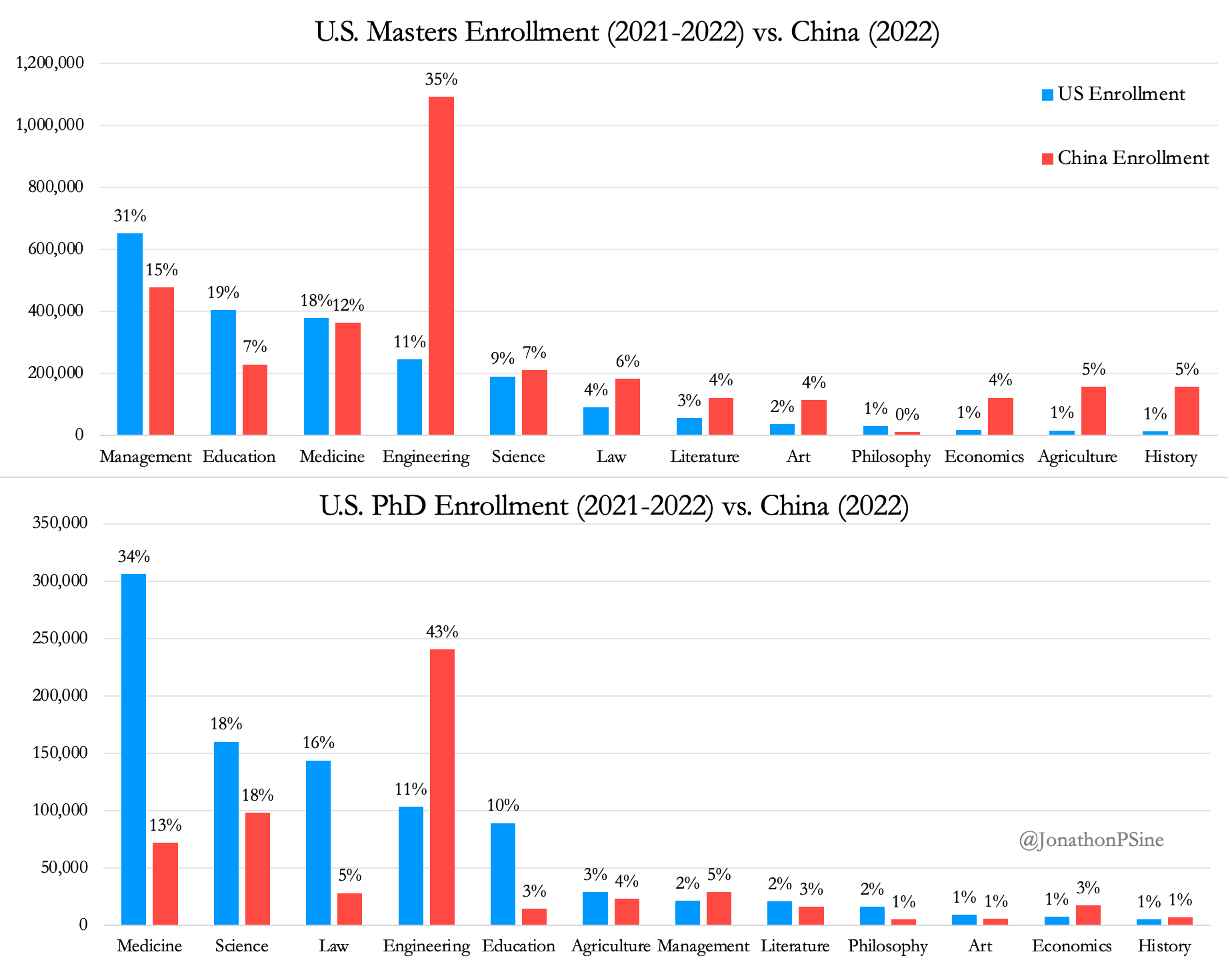 Meanwhile, I also re-group America’s 3.2 million graduate students into Chinese disciplines for comparability. In any one year, America has roughly 120,000 students enrolled J.D. degree programs (and ~20,000 other non J.D. programs). In other words, only 4% of American graduate students are enrolled in law. America thus has a roughly equivalent number of PhDs enrolled in engineering and physical sciences (not including masters) as it does in law schools.