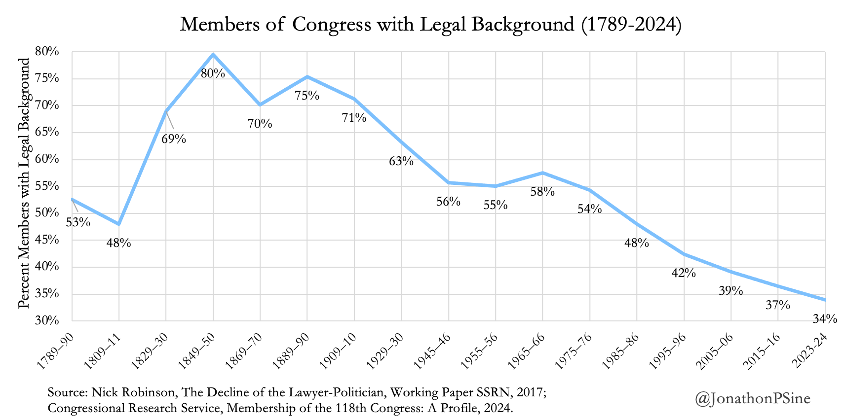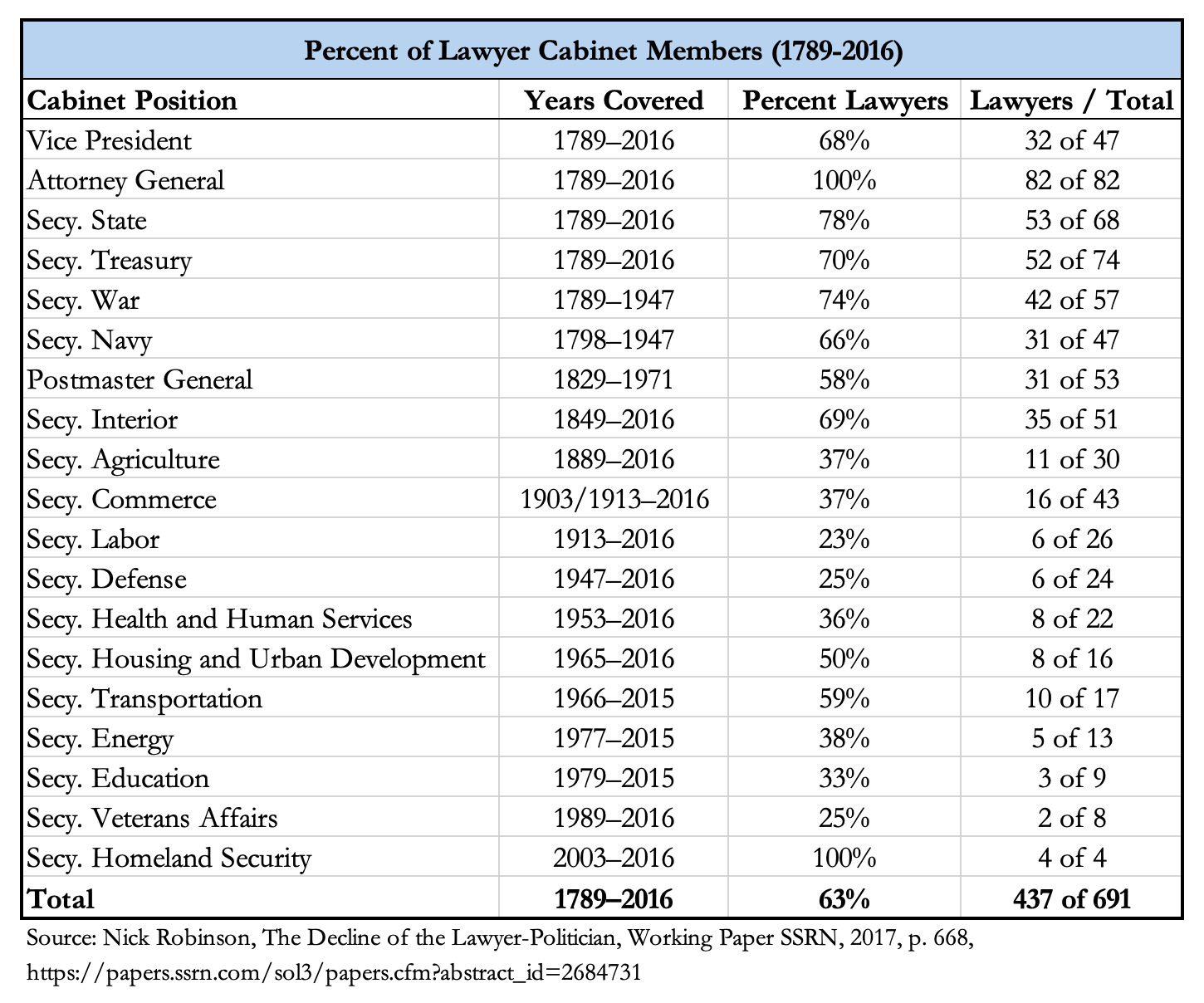 From the signing of the Constitution in 1789 to 2016, 63% of all Cabinet members have been lawyers. While I don’t have time series data, the disproportionate share likely still holds. And, as Wang points out in the book, "from 1984 to 2020, every single Democratic presidential and vice-presidential nominee went to law school” (p. 4). Only two Presidents, Jimmy Carter and Herbert Hoover (who lived in China for a time), ever worked as engineers. The United States, Wang writes, “has a government of the lawyers, by the lawyers, and for the lawyers.”