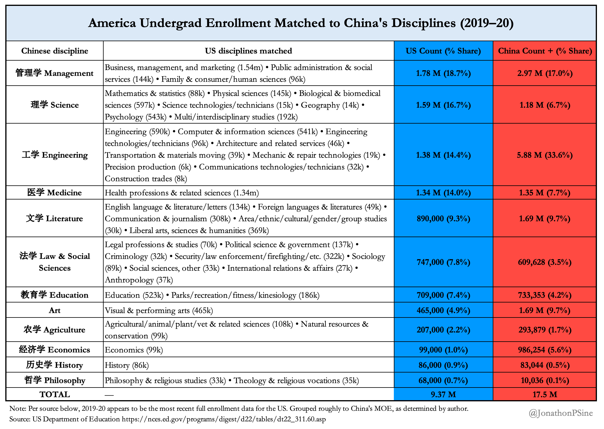 Below I re-group US college majors according to Chinese disciplines to allow for rough comparison. Surprisingly, the ratio of science/engineering to humanities/social sciences is 2:1, the same as in China (if one groups management with science/engineering, as I also do for China). There are more American undergraduates in STEM than one might expect from news headlines—or from reading Breakneck.