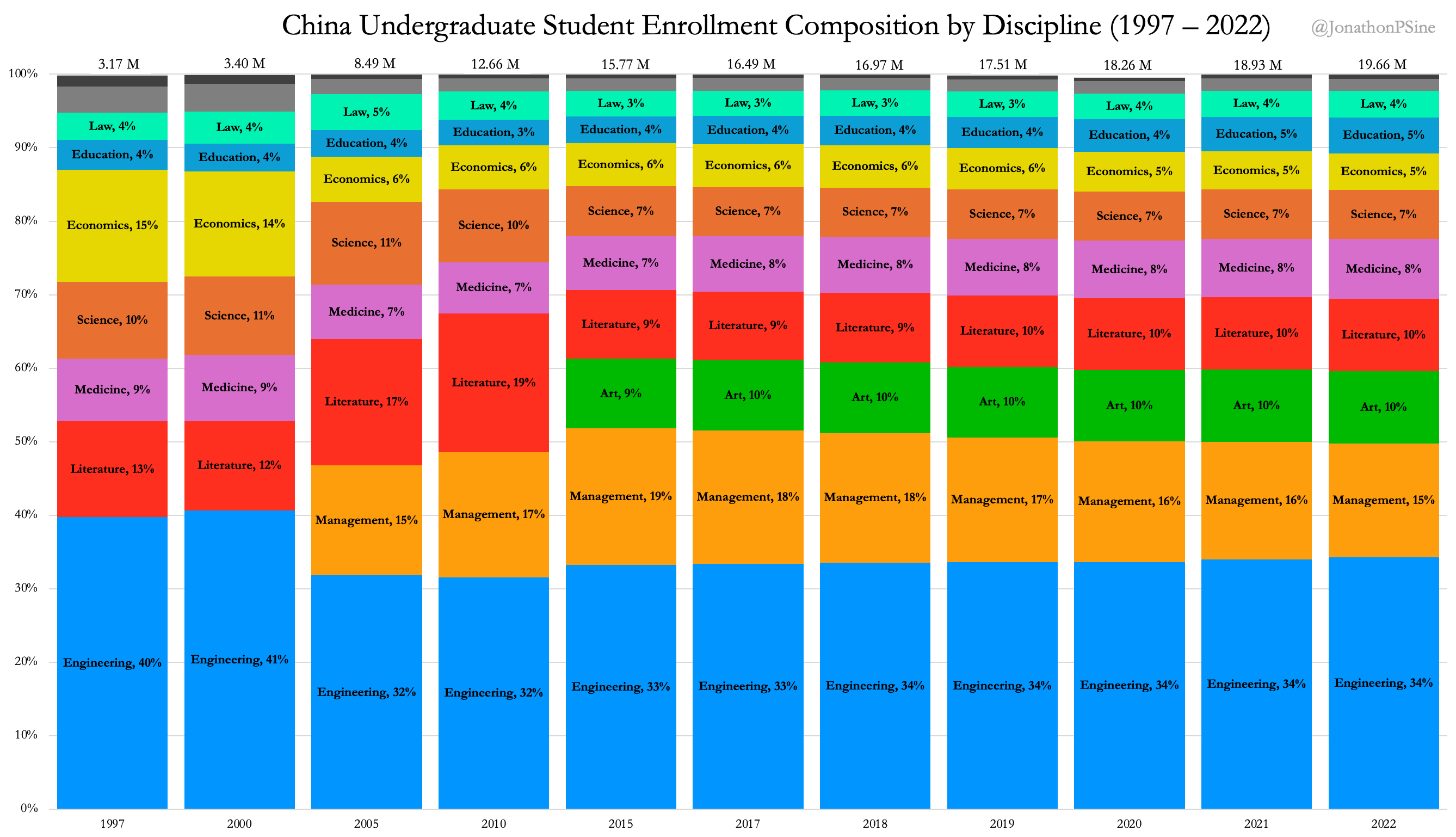 And even as enrollment has grown, the split between humanities / social sciences (philosophy, economics, law, education, literature, history, art) vs science / engineering (science, engineering, agriculture, medicine, management) remains roughly one-third to two-thirds. And the funniest stat: Engineering: 6,742,664 vs. Philosophy: 12,400.