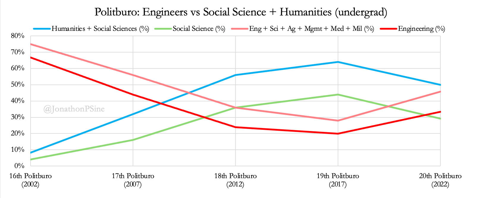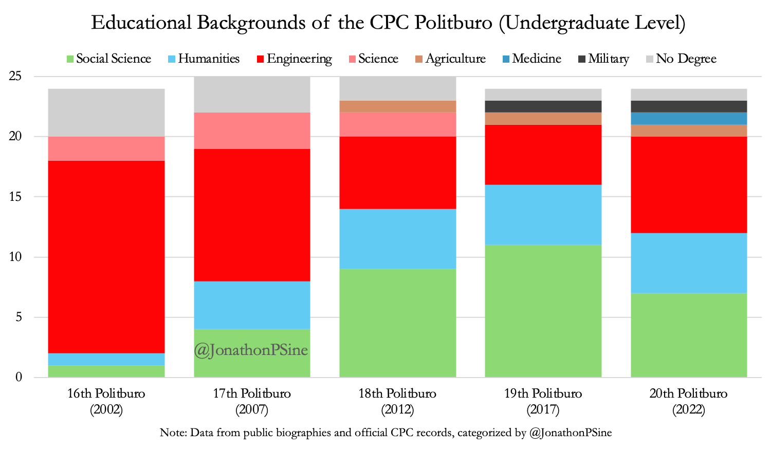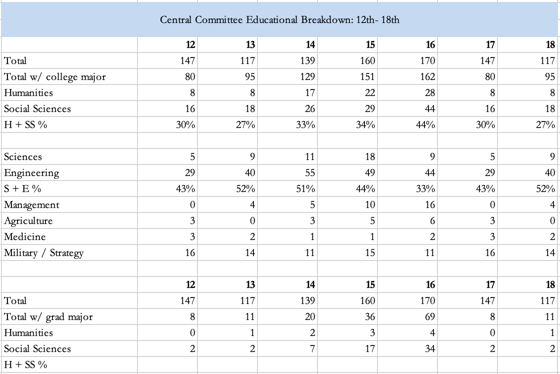 For the sake of completeness I wanted to extend the analysis to the entire Central Committee. But data completeness issues stopped me. Still, from the 12th Central Committee (1982) up to the 16th (2002), we do see a similar trend of increasing pluralization in educational backgrounds (there does seem to be a shift back toward engineering in the less comprehensive data thereafter).23