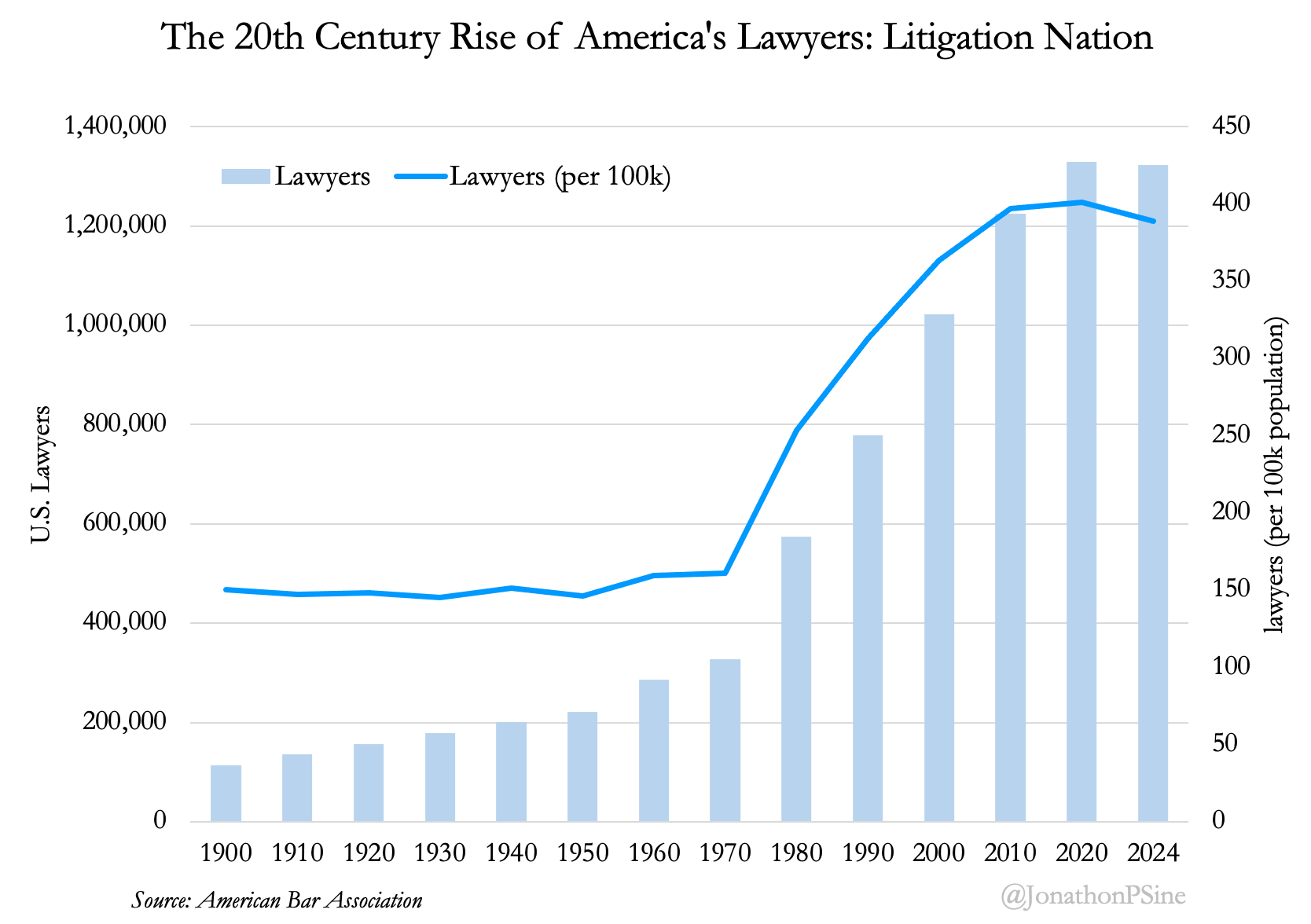 Breakneck is a bit more singular in pinning the blame on lawyers, but the diagnosis is fundamentally the same as several recent books, from Abundance to Why Nothing Works to Public Citizen. Breakneck joins this chorus. It was not only the rise in lawyer numbers, they posit, but more importantly a comprehensive shift in lawyerly focus in the 60s/70s toward oppositional litigation.