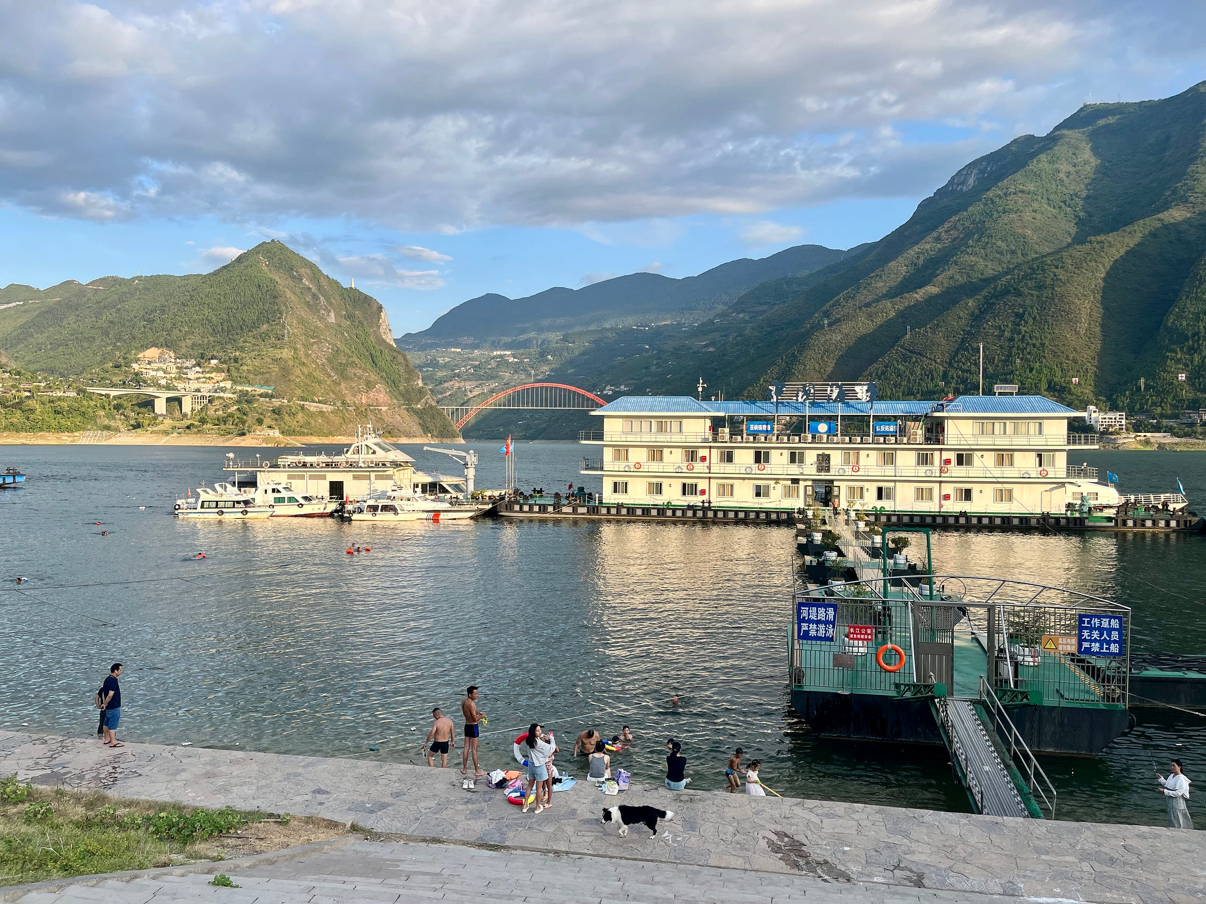 Wandering into town, I ask a man if people ever swim in the river. “Not really,” he misinforms me. A more enlightened fellow, overhearing, interjects. Locals gather at the base of the grand staircase around 6 p.m., after school and work. Off I go. It is a beautiful late summer evening as I arrive. Local kids and I have a swimming race as the sun slowly sets over the Yangtze.3