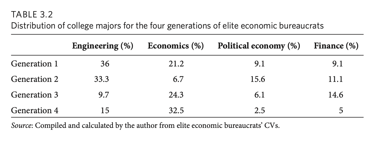 There is a broader story here as well of increasing managerial specialization across the bureaucracy. The education background of China’s elite economic bureaucrats, for example, was once engineering dominated, but now reflects more specialization in economics. (MIIT, the main industrial policy organ, is dominated by engineers, befitting its role).