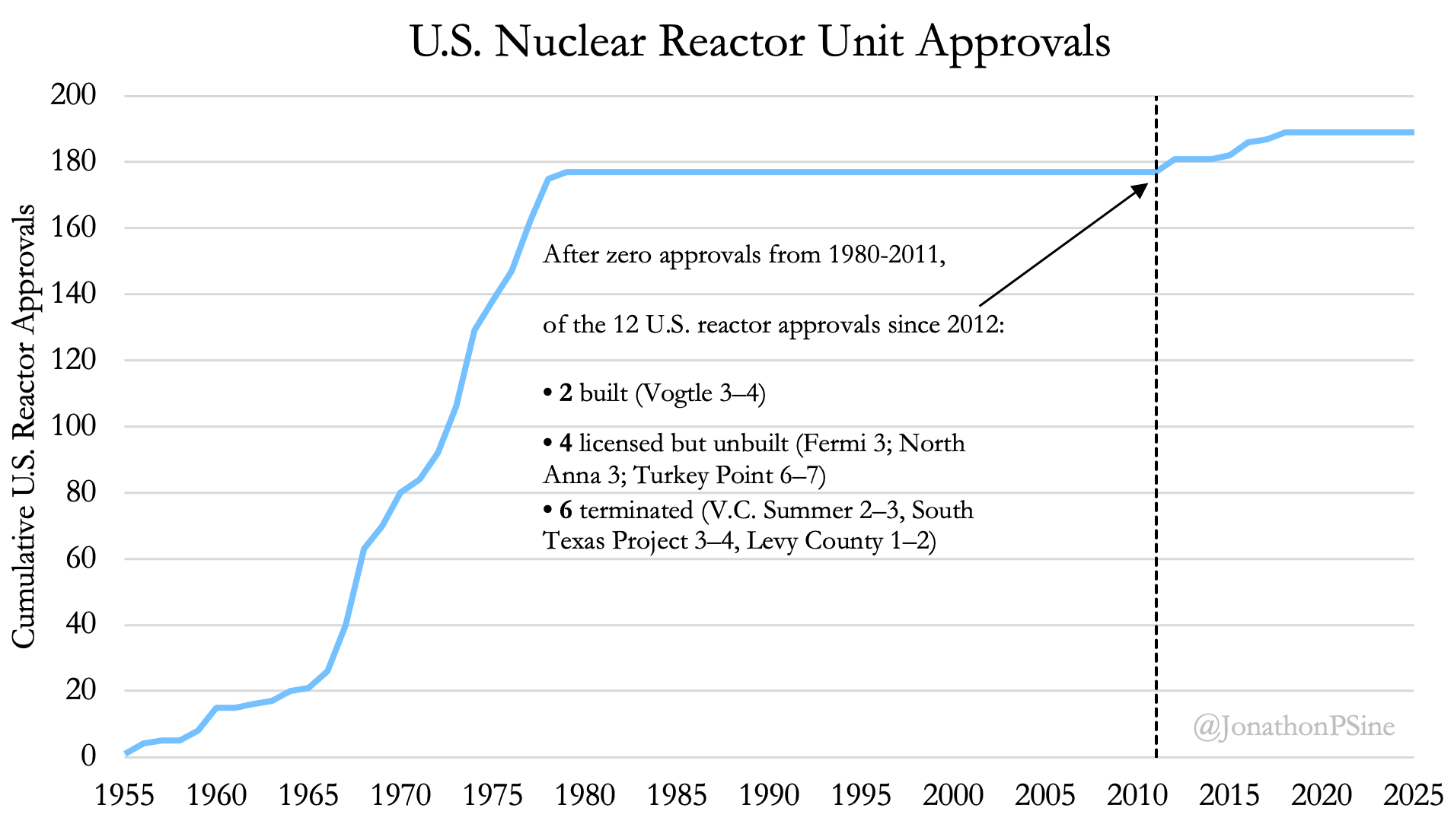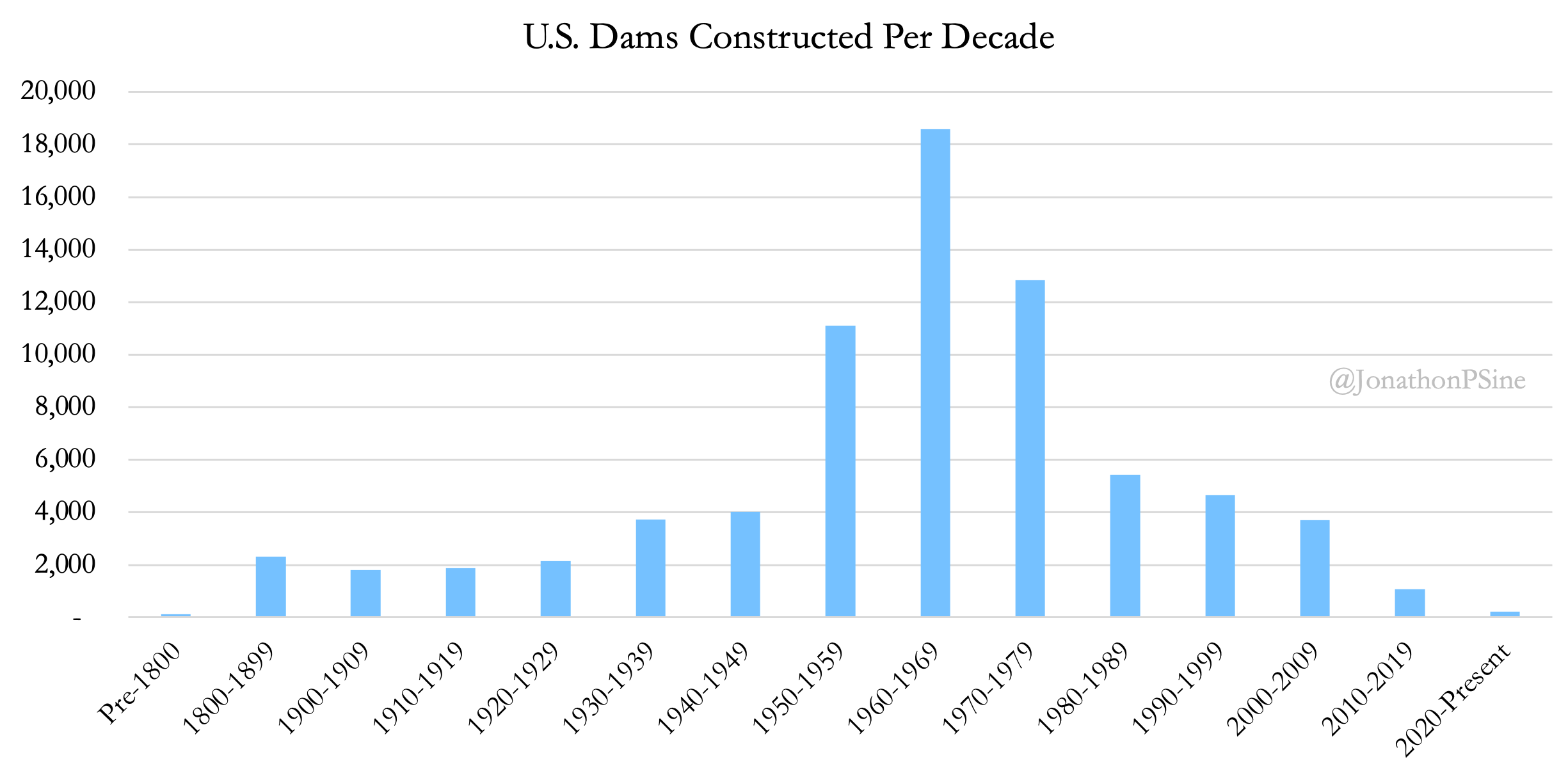 Consider America’s hydraulic construction (dams). Or America’s expressway buildout. Or nuclear facilities—where from 1955 to 1979 we went from 1 to 177 approved reactor units, and then approved not a single new one until 2011 (today, China is currently building 29 reactors, America zero). One can point to any number of indicators demonstrating the slowdown in the built environment.37