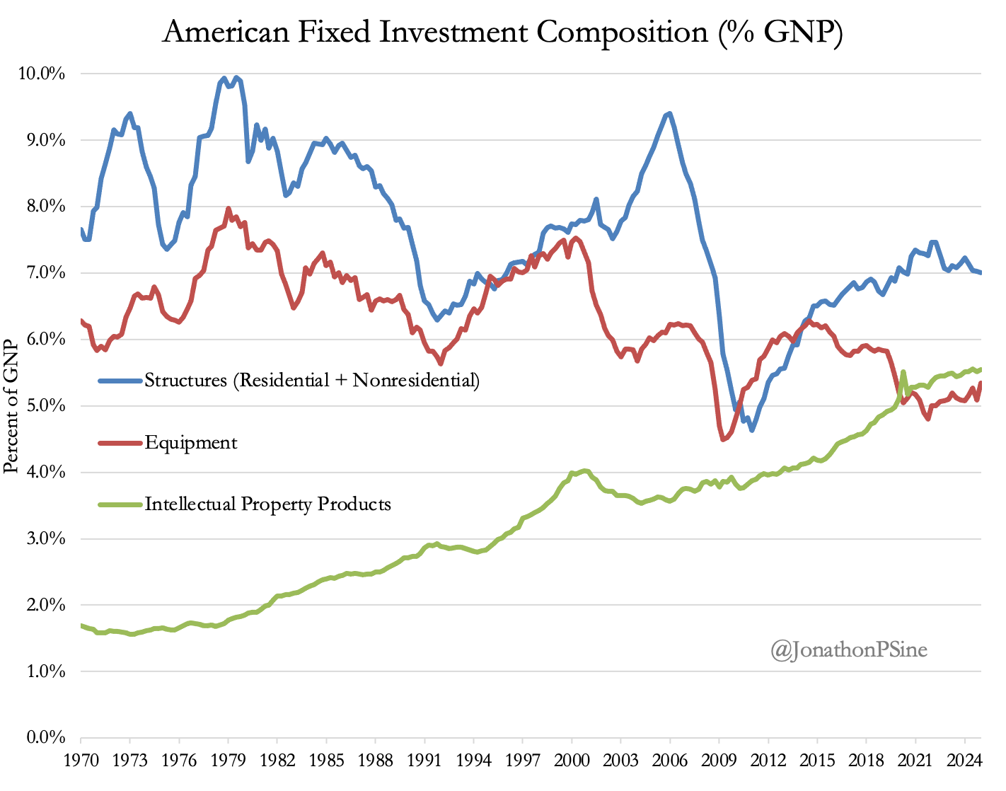 If China has allegedly overbuilt, then America has under built. Whether housing, infrastructure, or business capital expenditure: development of the built environment too often feels stagnant. One big piece of evidence: investment in equipment and structures as a share of American GNP is down 3 percentage points from where it was in the 1970s.