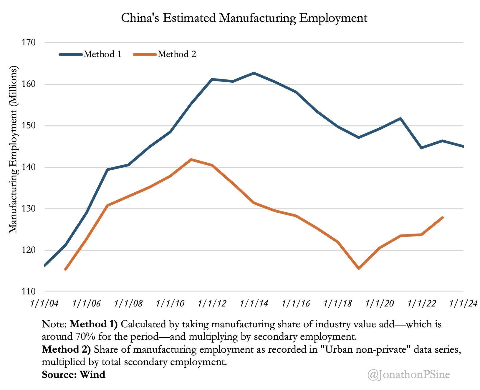 Yet the labels “breakneck” and “engineering state” fit less neatly today than they did in the 1980s through the 2010s. The diversification of Politburo members’ educational backgrounds hints at this shift, but the deeper reason is that China has passed an inflection point in investment and manufacturing growth. Even the 14th Five-Year Plan’s modest pledge to keep manufacturing’s share of GDP “basically stable” requires an almost herculean push against the historical tide. China had already lost the equivalent of America’s entire manufacturing labor force in a decade, prior to stabilizing or increasing (depending on measurement method) around the time of the 14th FYP.