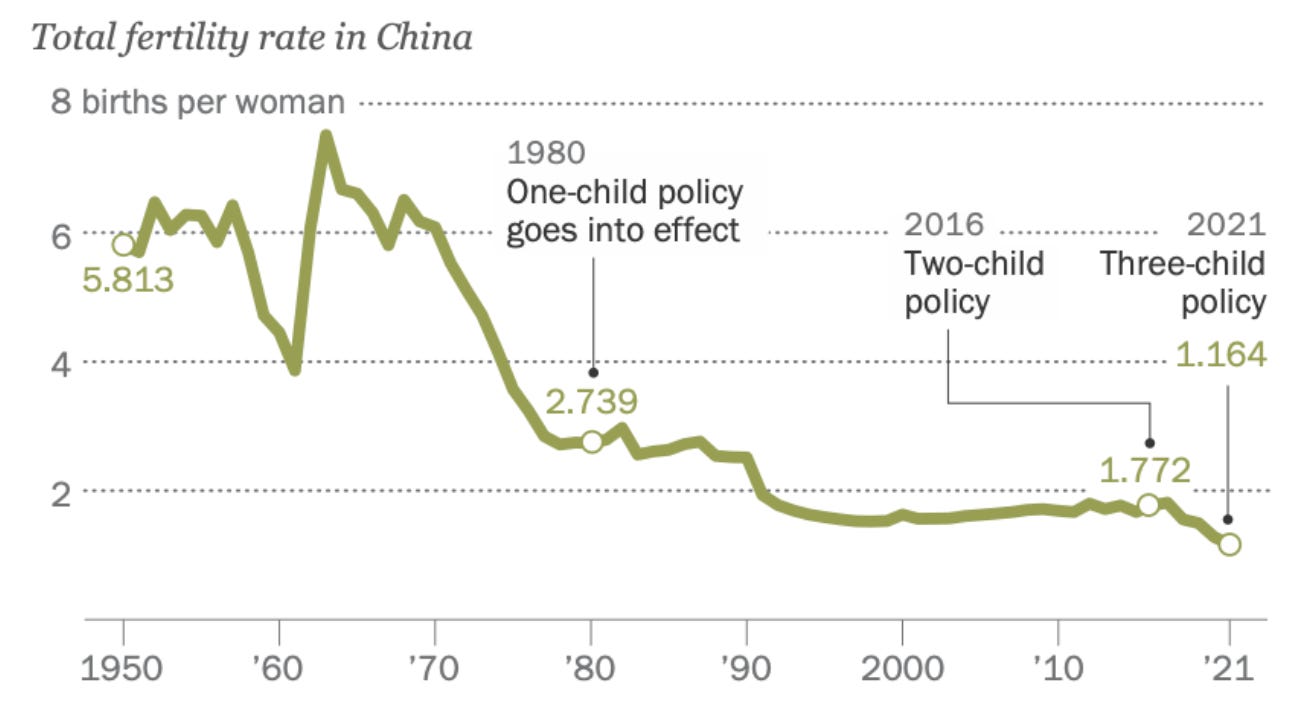 The most nihilism-inducing part of the entire saga is that China’s fertility rate, like most of the world and particularly East Asia, was already rapidly declining. Over 300 million abortions and 130 million sterilizations were forced down people’s throats—inflicting often unspeakable trauma across an entire generation of people—with practically no impact on the trajectory. It is ironic that this was the first major policy initiative of the allegedly more “pragmatic” post-Mao leaders, almost all of whom, from Deng on down, pushed for it with enthusiasm.