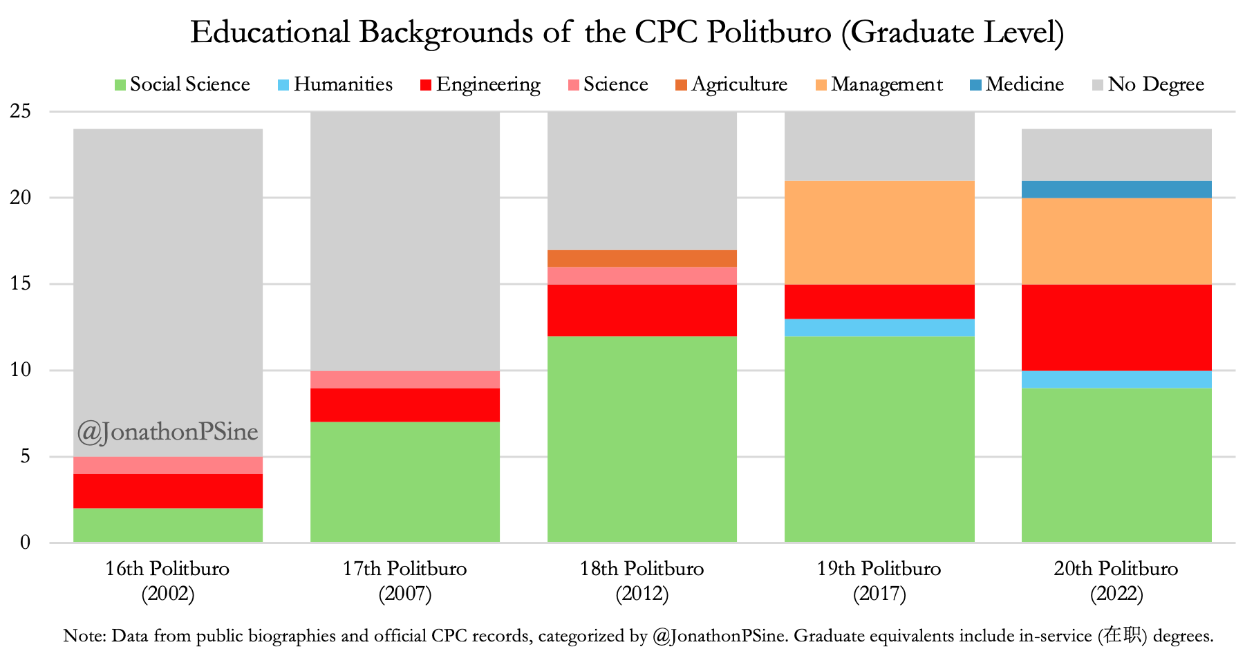 The graduate-level training Politburo members have received, meanwhile, shows a long-standing tilt toward social science and managerialism. Most of this education comes via the Party school system. Fieldwork at lower levels, mostly done under Hu Jintao, confirms this system wide focus on management, social science, and law (though there are also technocratic/engineering classes). Overall, graduate training for China’s elite leaders is mostly a balance of ideology instilling “Leninist party discipline” with education on becoming “modern, competent managers of increasingly complex organizations.”22